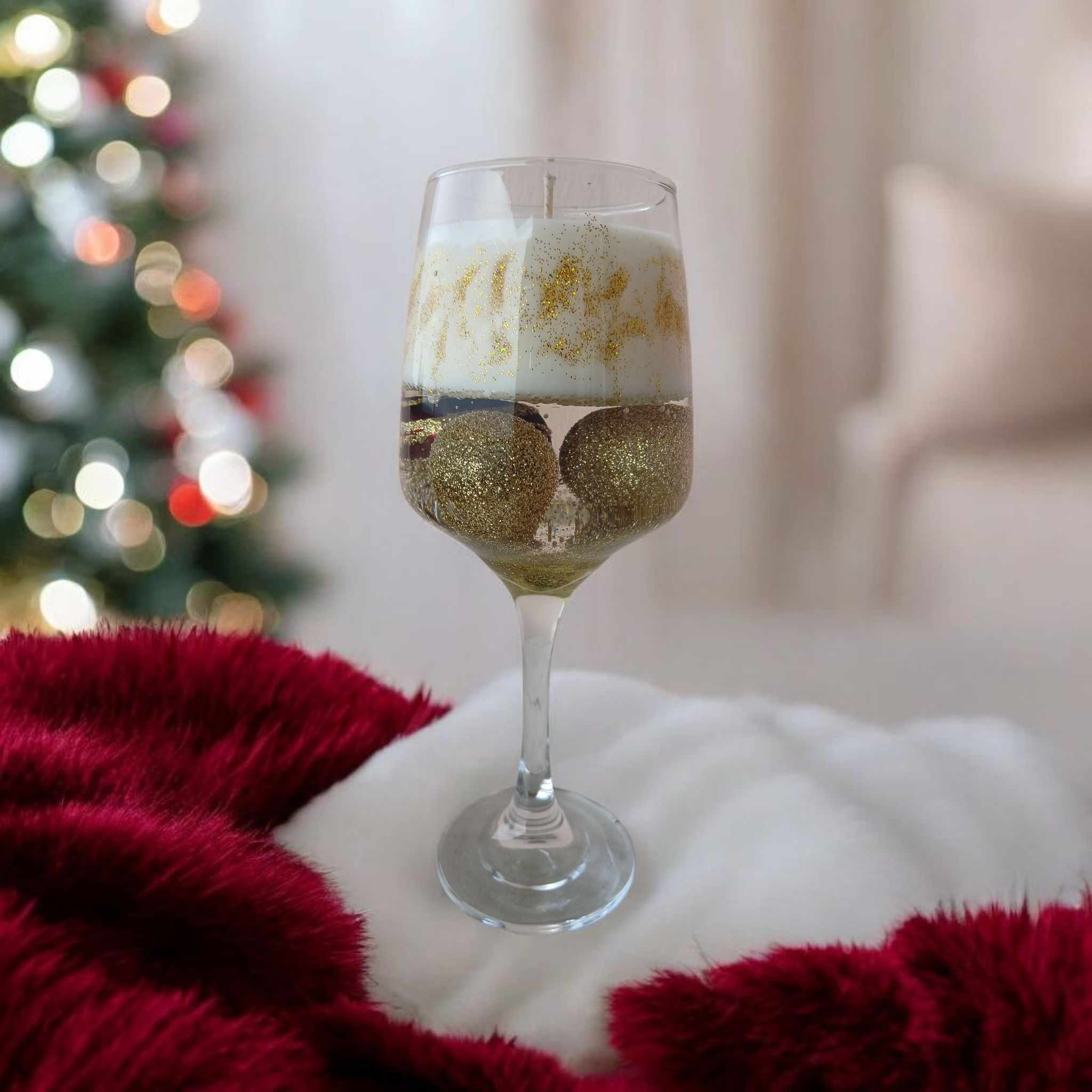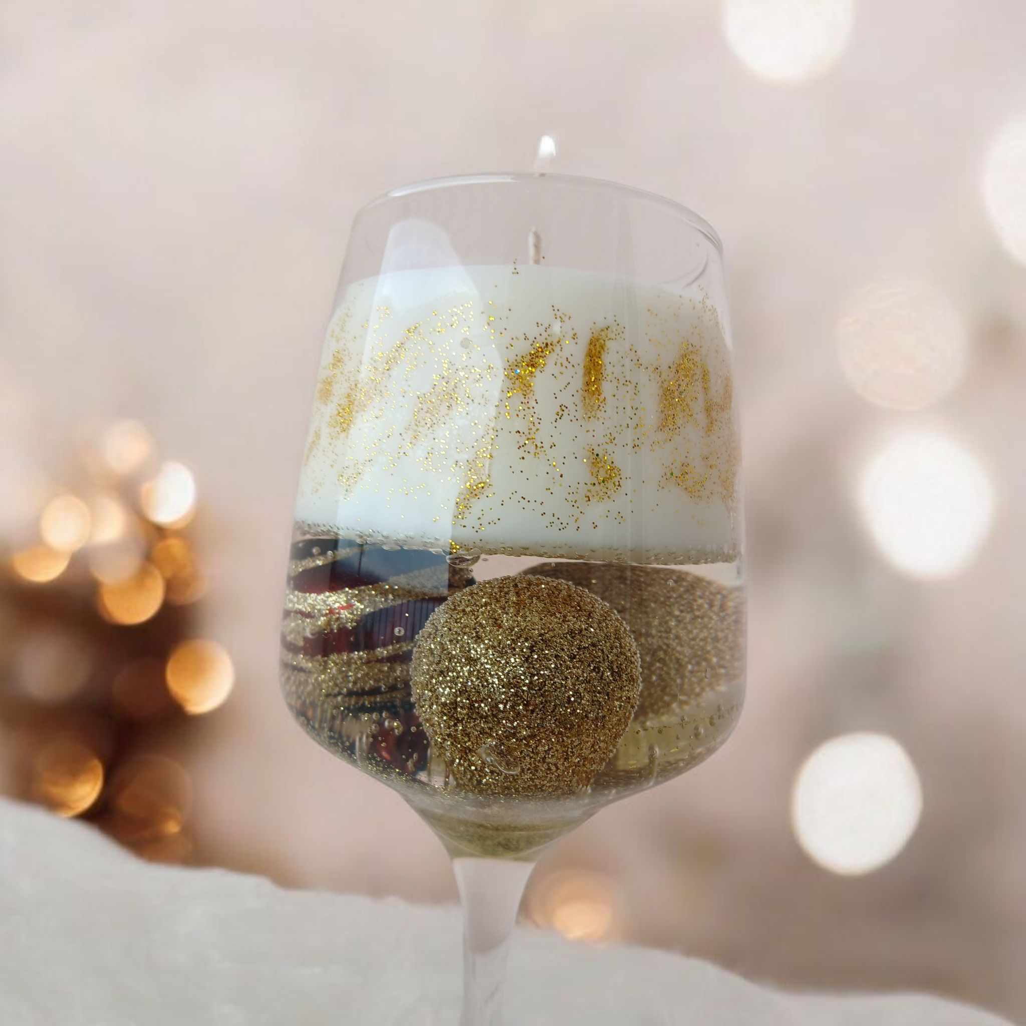 Χριστουγεννιάτικο Aρωματικό Φυσικό Κερί σόγιας και κερί Gel σε γυάλινο ποτήρι κρασιού. Διακοσμημένο με χριστουγεννιάτικα στολίδια.