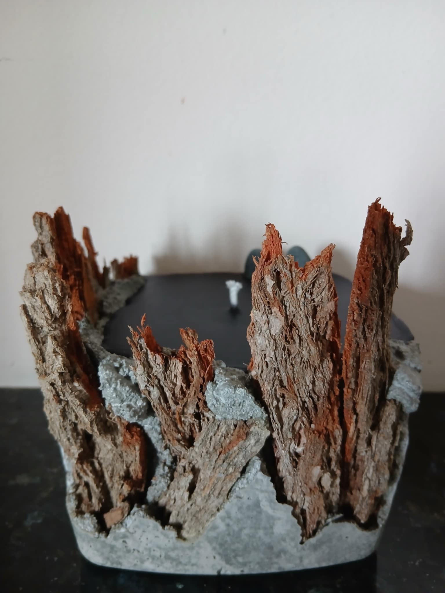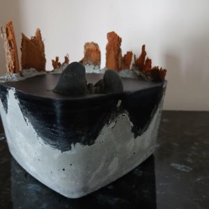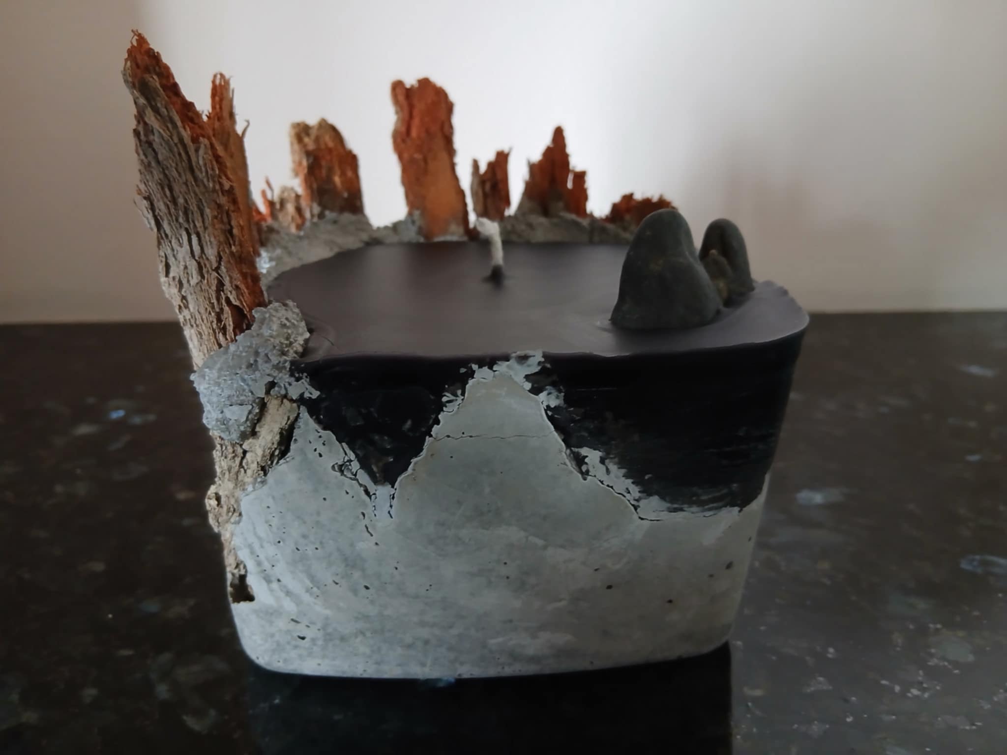 Κερί από υψηλής ποιότητας εξευγενισμένη παραφίνη, με φυσικές πέτρες θάλασσας, τσιμέντο και διακοσμημένο με φυσικό φλοιό πεύκου.
