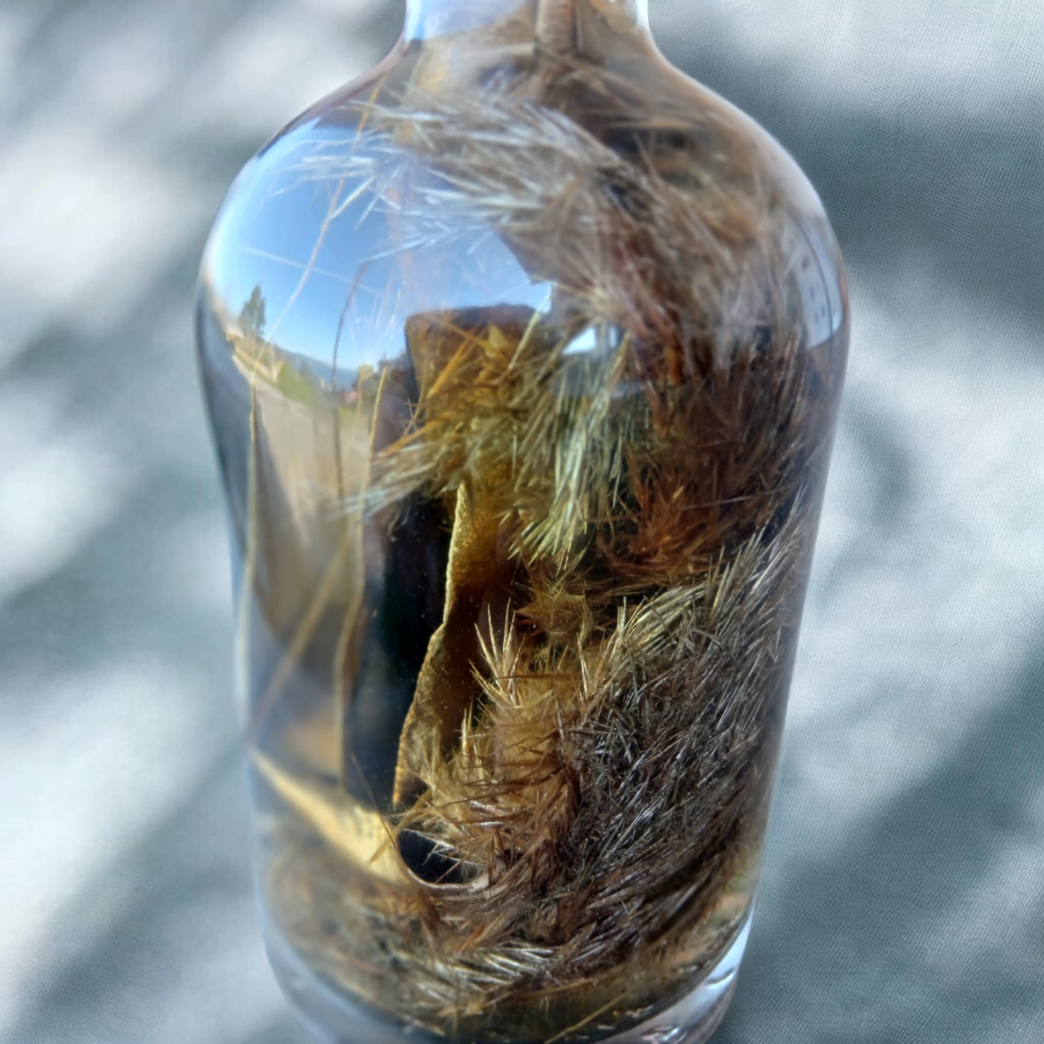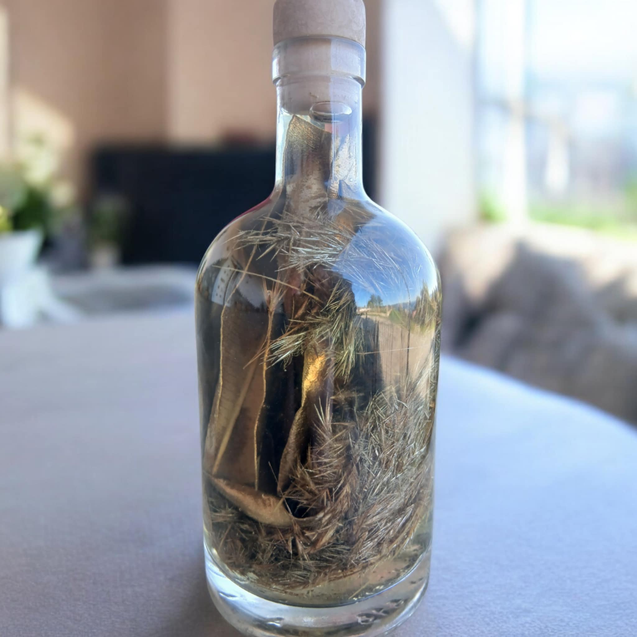 Περιέχει νερό και είναι διακοσμημένο με Pampas και αποξηραμένα φύλλα Δάφνης.