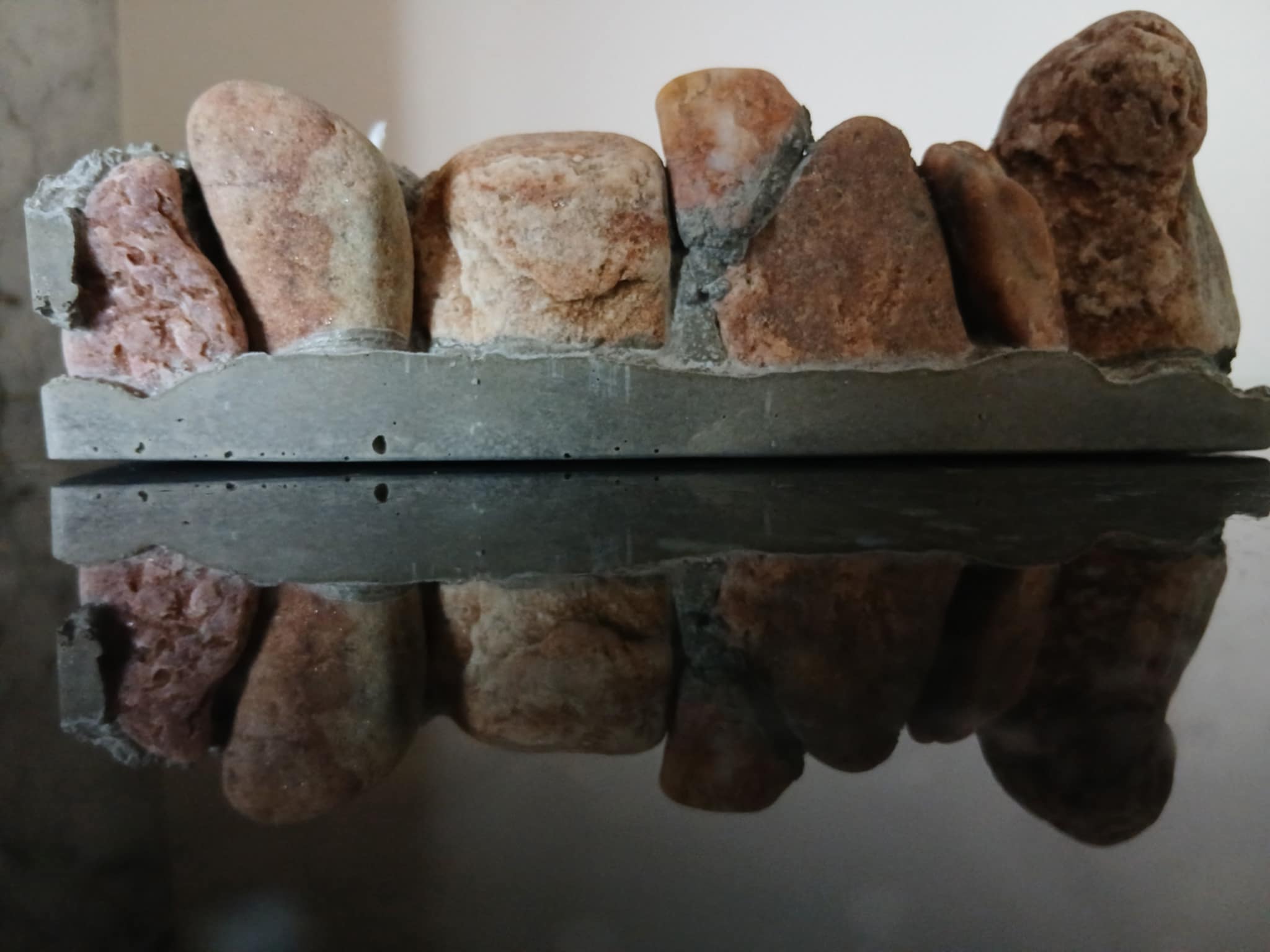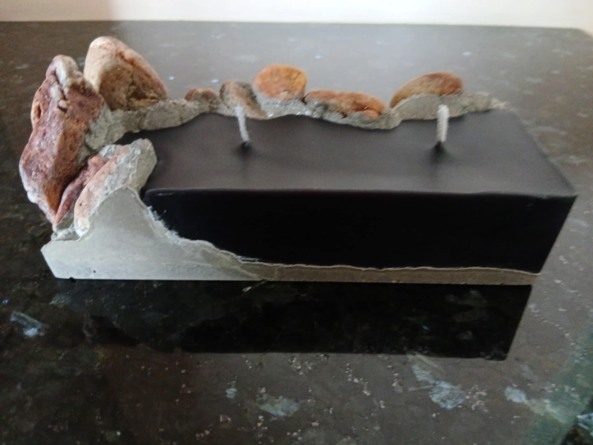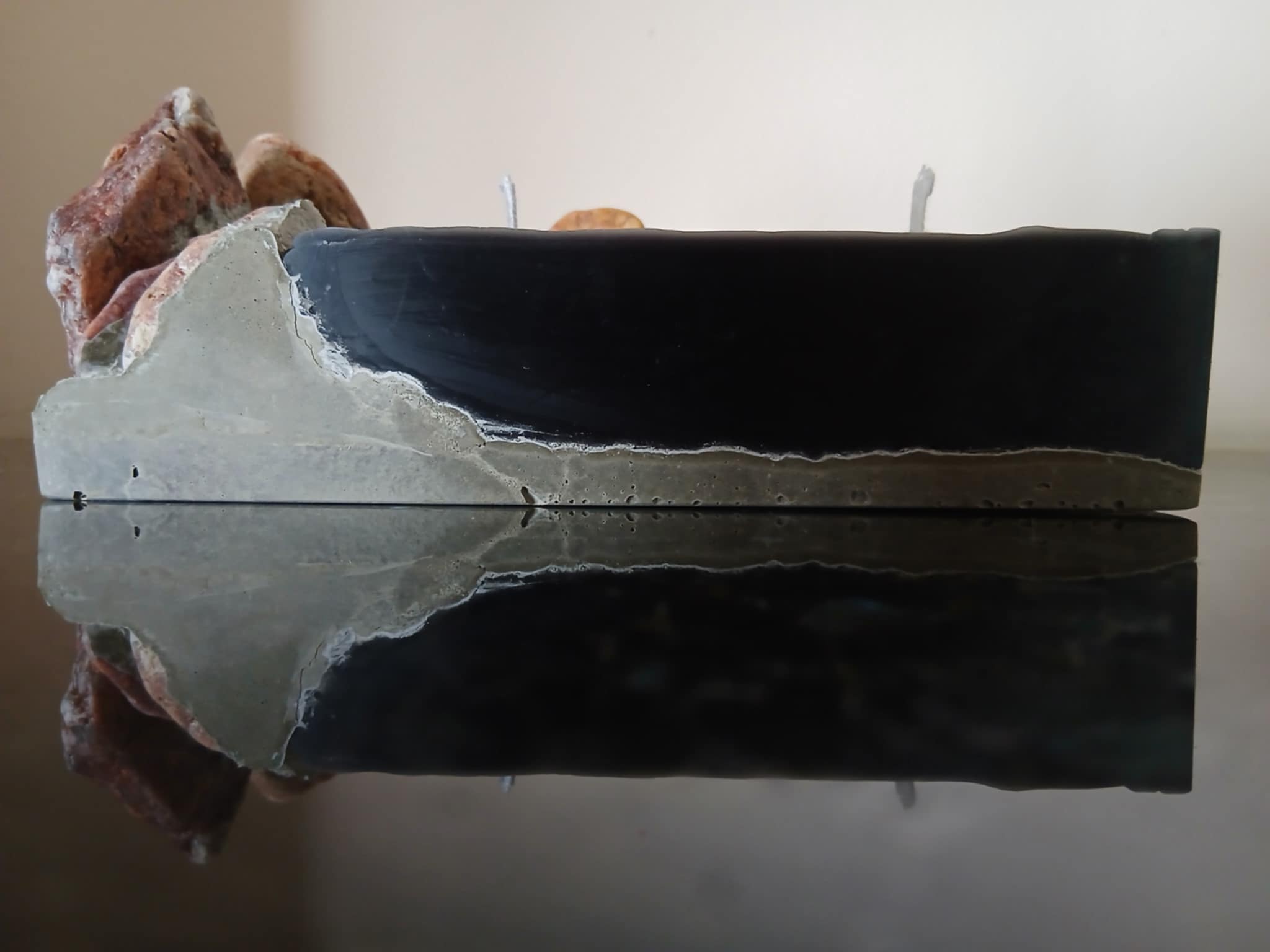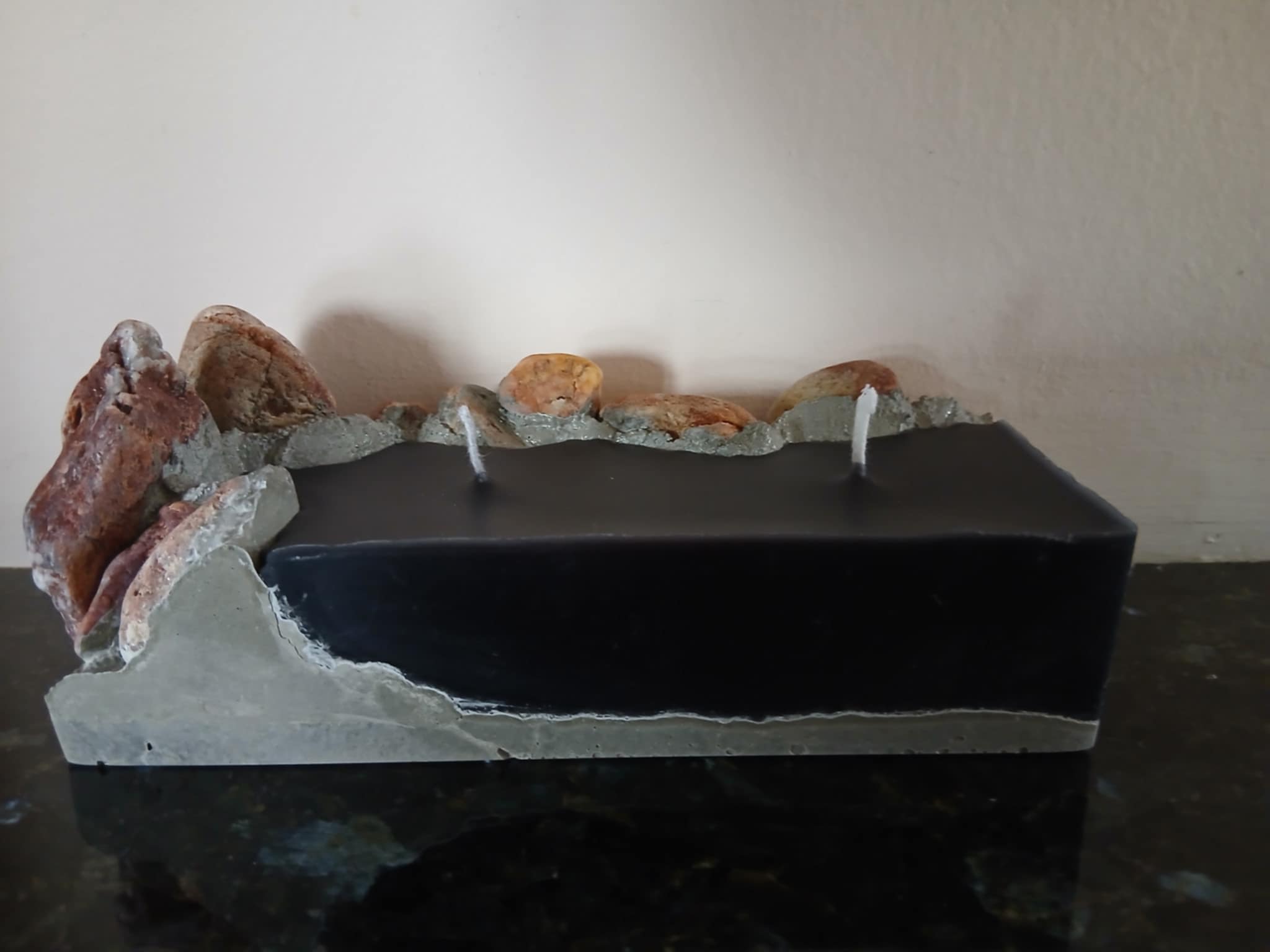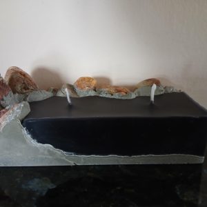 Κερί από υψηλής ποιότητας εξευγενισμένη παραφίνη, με φυσικές πέτρες θάλασσας, τσιμέντο και δύο φυτίλια.